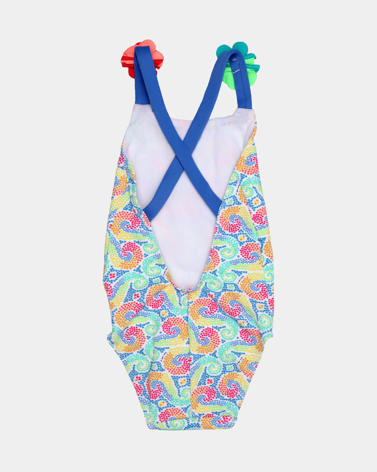 Este bañador con el estampado Gaudí está confeccionado con tejido de poliamida con un 18% de lycra que le da gran elasticidad. En los hombros, tiene dos florecitas de color rojo y verde que van cosidas para evitar que se pierdan. En la parte delantera lleva bordado el anagrama de nuestra marca: una familia de patitos. Las figuras de esta aplicación tienen un cierto relieve.