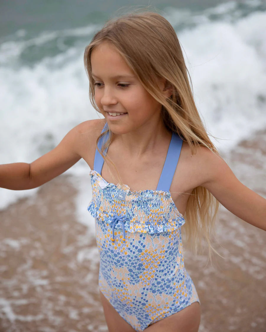 Este bañador de la serie Tuli, en tonos azules y amarillos, está confeccionado con tejido de poliamida con un 18% de lycra que le da gran elasticidad. En el pecho lleva bordado el anagrama de nuestra marca: una familia de patitos. Las figuras de esta aplicación tienen un cierto relieve. Además, en Al Agua Patos estamos muy concienciadas con los efectos del sol, es por eso que este producto cuenta con protección solar con un certificado de factor 80 de protección UVA.