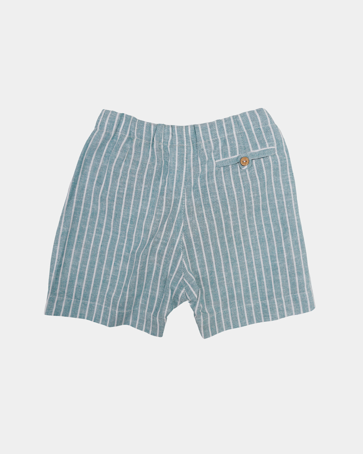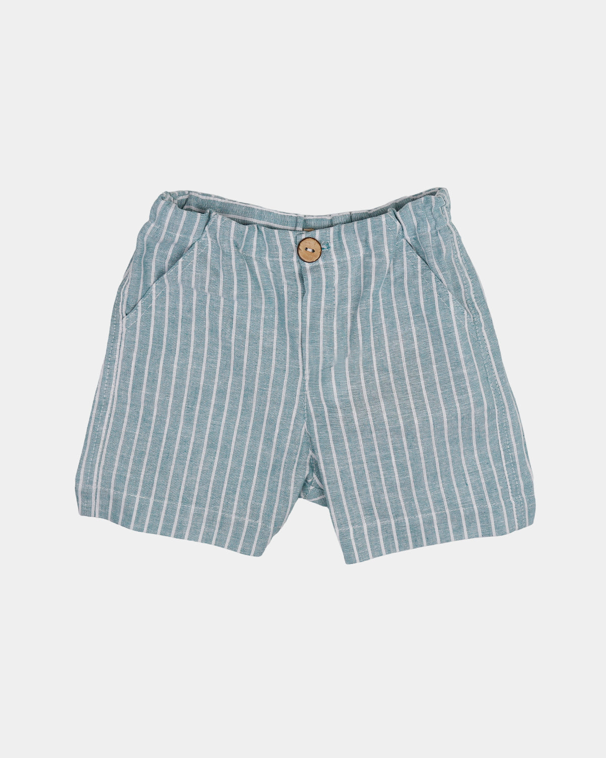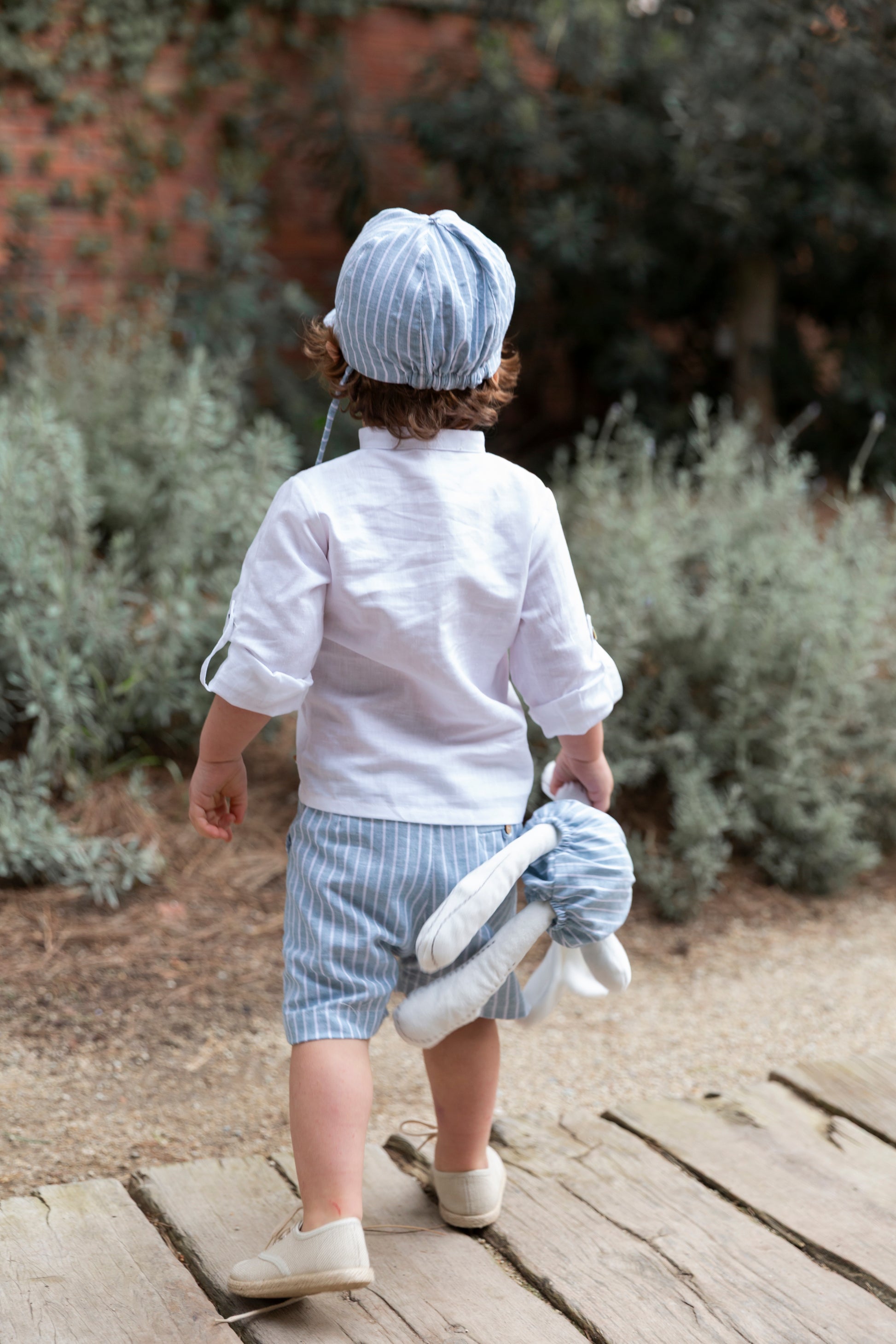 Bermuda blanca larga por encima de la rodilla para bebés y niños de 1 mes a 8 años. Se brocha con una cremallera y un botón de madera y en el trasero lleva un bolsillo con vivo. Confeccionada en tejido de lino.