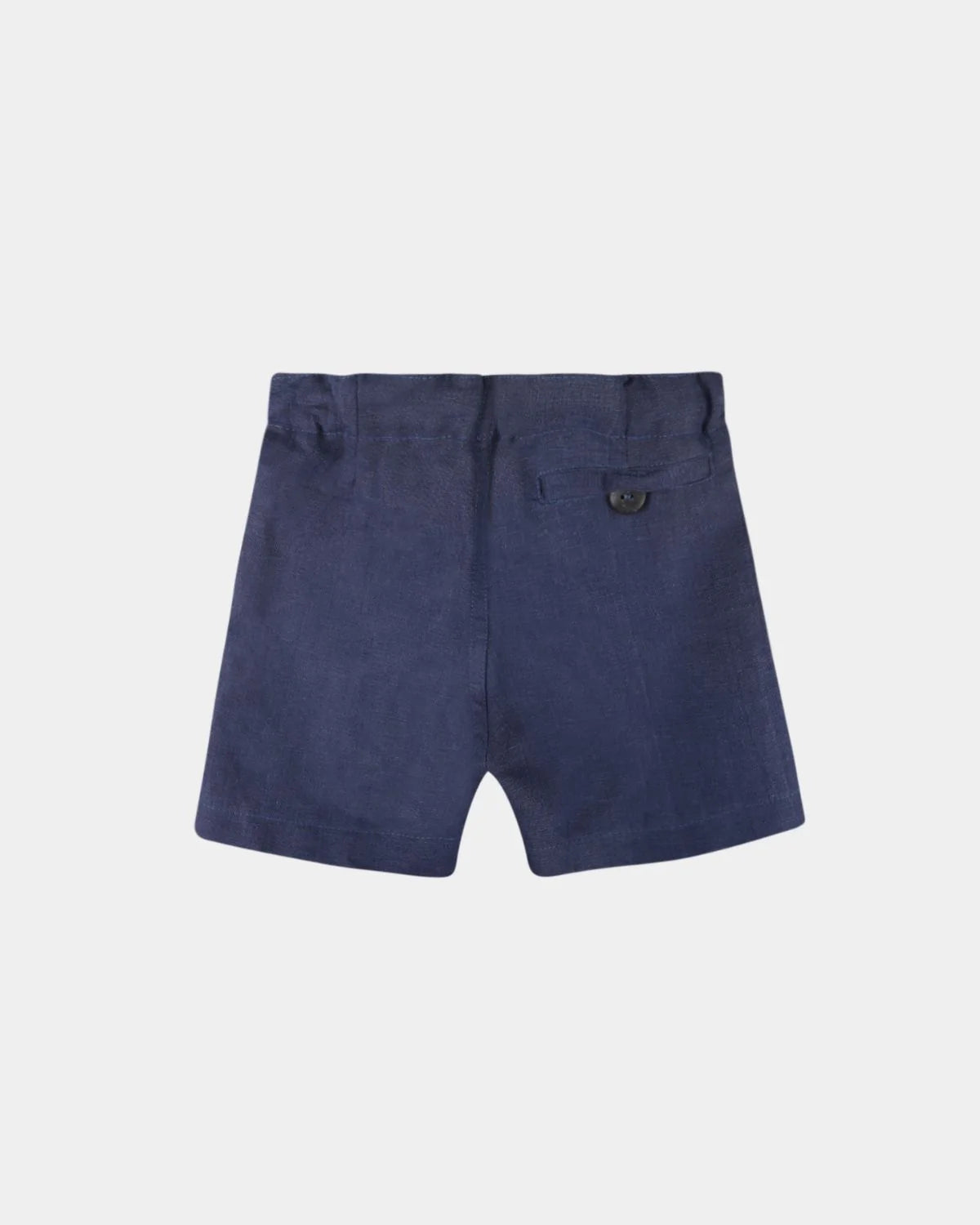 Bermuda azul larga por encima de la rodilla para bebés y niños de 1 mes a 8 años. Se brocha con una cremallera y un botón de madera y en el trasero lleva un bolsillo con vivo. Confeccionada en tejido 100% algodón.