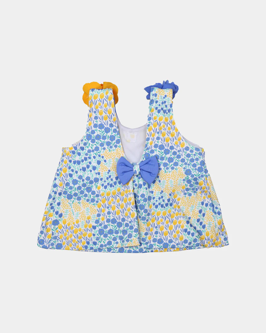 Conjunto confeccionado en tejido de poliamida con un 18% de lycra que le aporta gran elasticidad. Está compuesto por un vestido y un cubre pañal de la serie Tuli. El vestidito tiene un amplio escote en la espalda que permite su fácil colocación. Los lacitos, además de anudados están cosidos para evitar que se pierdan. La braguita lleva unas gomas en los camales extremadamente elásticas y suaves. Es adecuada para colocar sobre el pañal, pero también queda muy mona sin el. Esta prenda es adecuada para la playa, pero puede servir perfectamente para vestir en otras ocasiones. En la pechera lleva bordado nuestro anagrama formado por una familia de patos. Las figuras de esta aplicación tienen un cierto relieve. Además, en Al Agua Patos estamos muy concienciadas con los efectos del sol en nuestros peques, es por eso que este producto cuenta con protección solar con un certificado de factor 80 de protección UVA.