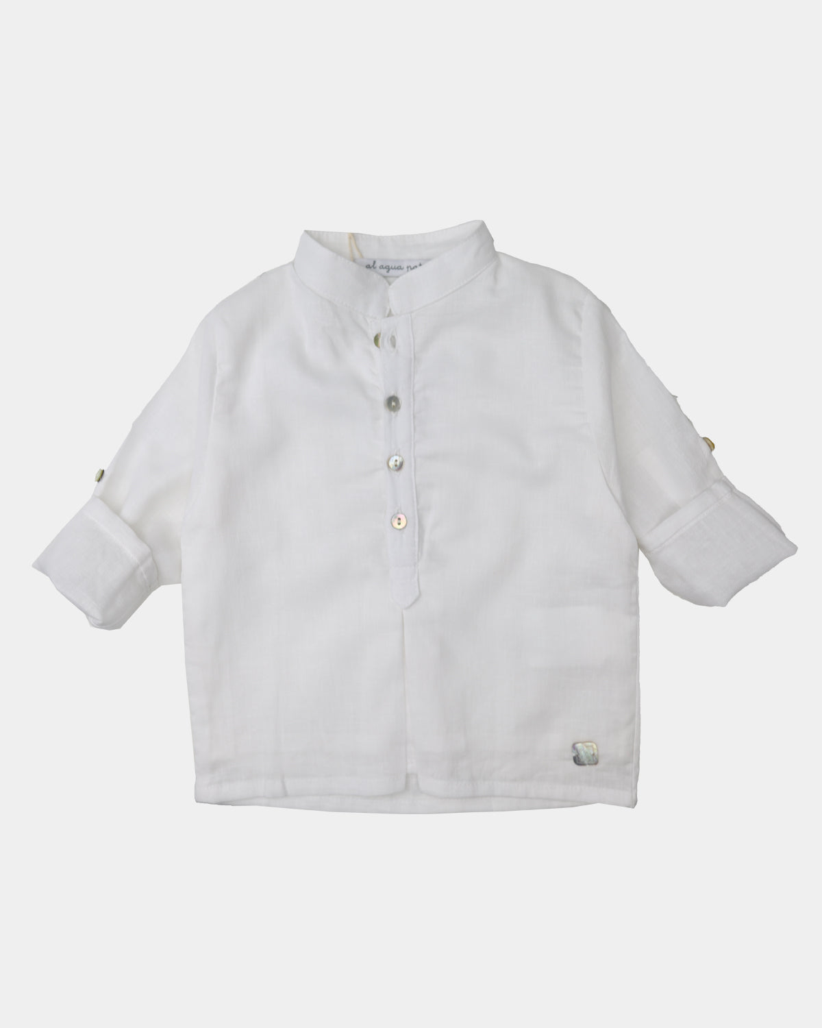Esta camisa tiene un cuello estructurado que la hace muy elegante. Se abrochada por delante con unos delicados botones de nácar. La manga es larga, pero se puede fijar arremangada a la altura del codo, con la pieza abotonada. Está confeccionada en un suave tejido de algodón.