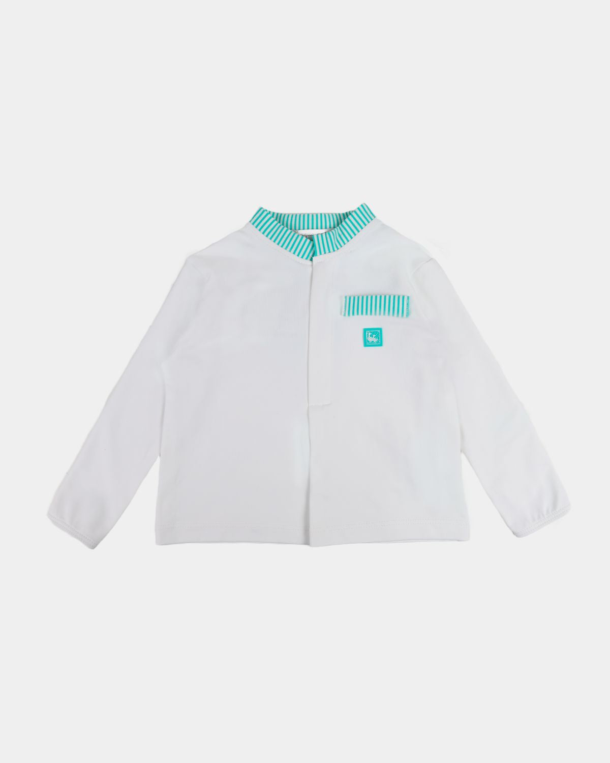 Esta es una camiseta de manga larga que lleva el cuello, la tapeta de la botonadura, y el bolsillo, ribeteados con el estampado de la serie Peras. Es una prenda ideal para verano, ya que es fresquita y transpirable.