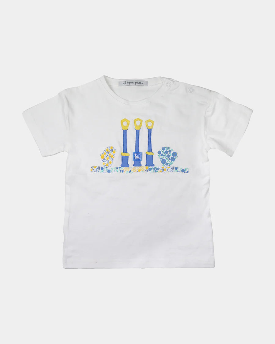 Camiseta de algodón 100% con un estampado relacionado con la línea Tuli. En el pecho tiene un diseño en tonalidades características de la serie Tuli. Las tallas mas pequeñas, hasta la 3 años, van abiertas por el hombro y abrochadas con prácticos automáticos, para facilitar su colocación.