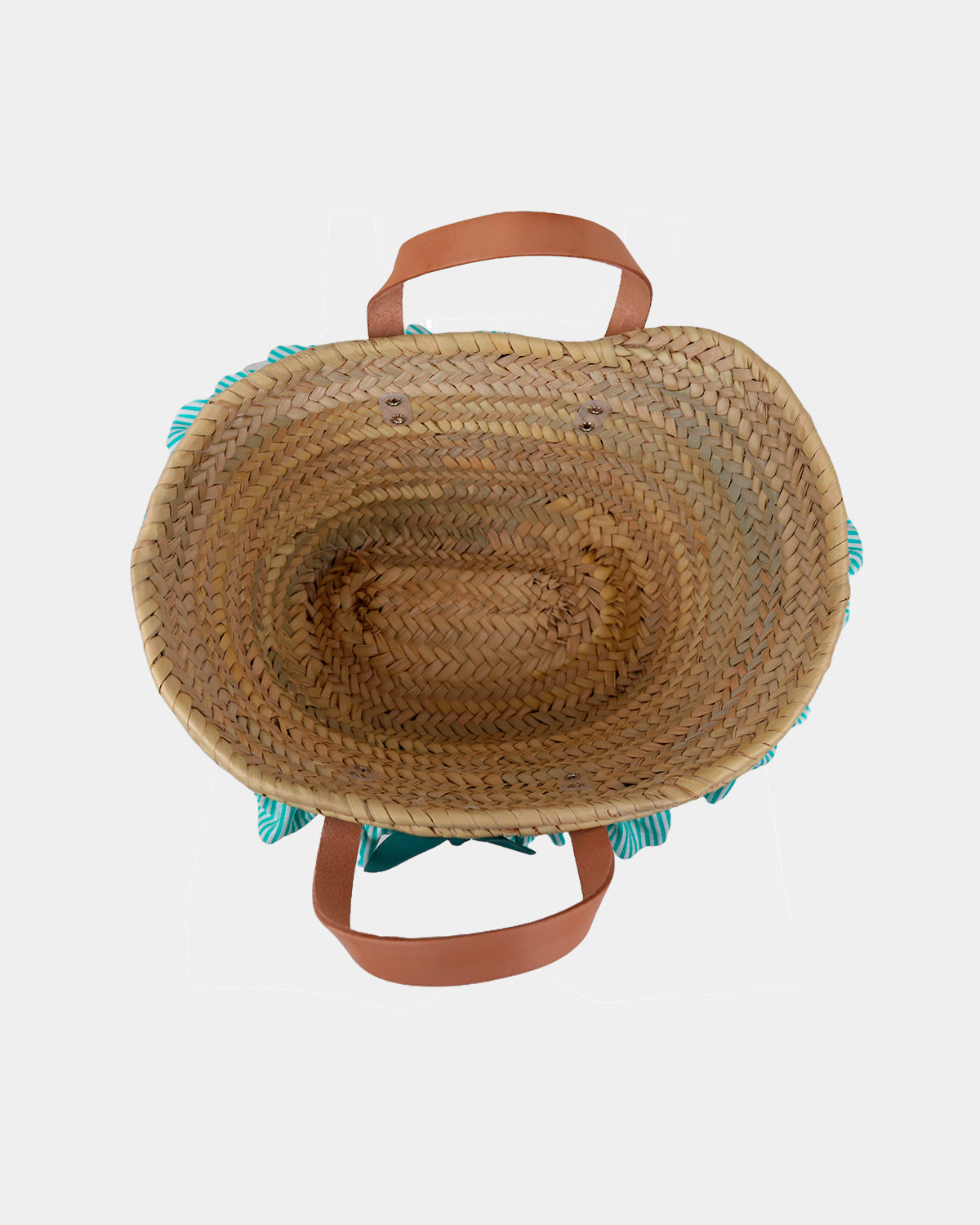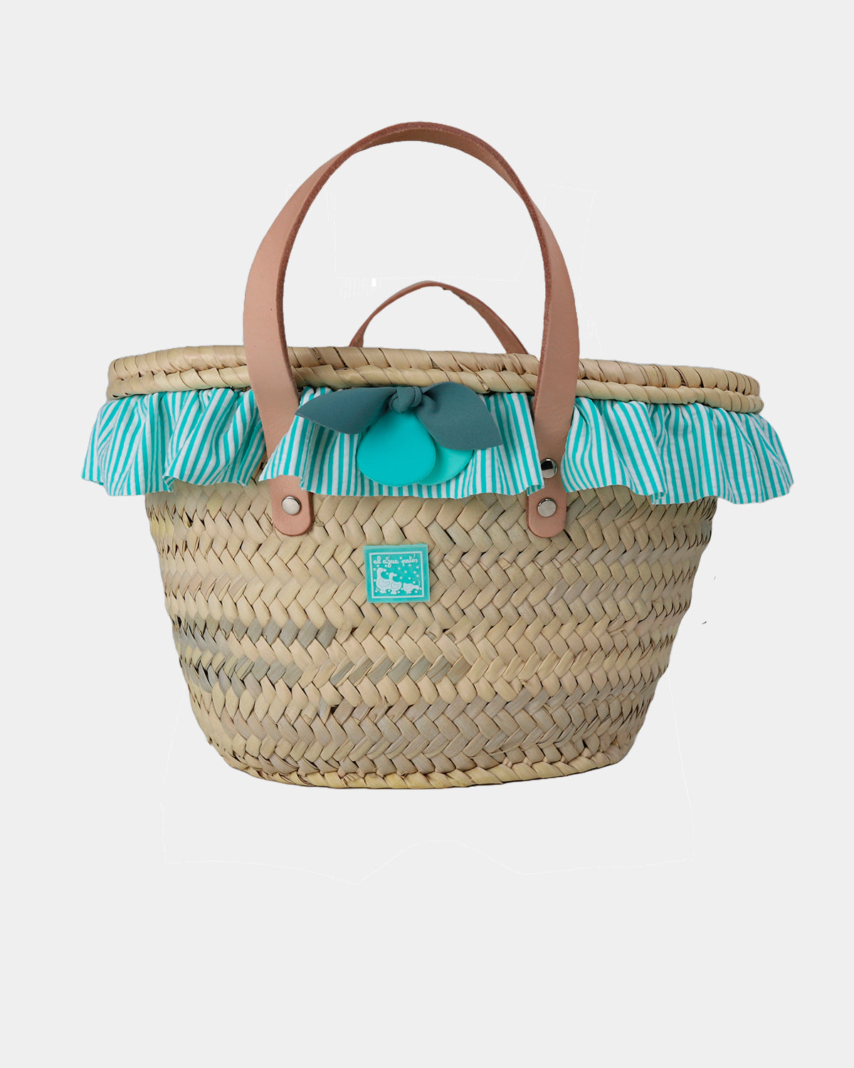 Este cesto de palma es el complemento perfecto para las mamás. Mide 20x44x12 cm y las asas son de color marrón. El tejido de la colección Peras es el que confecciona el volante que rodea todo el cesto. Debajo de las asas lleva unas florecitas.