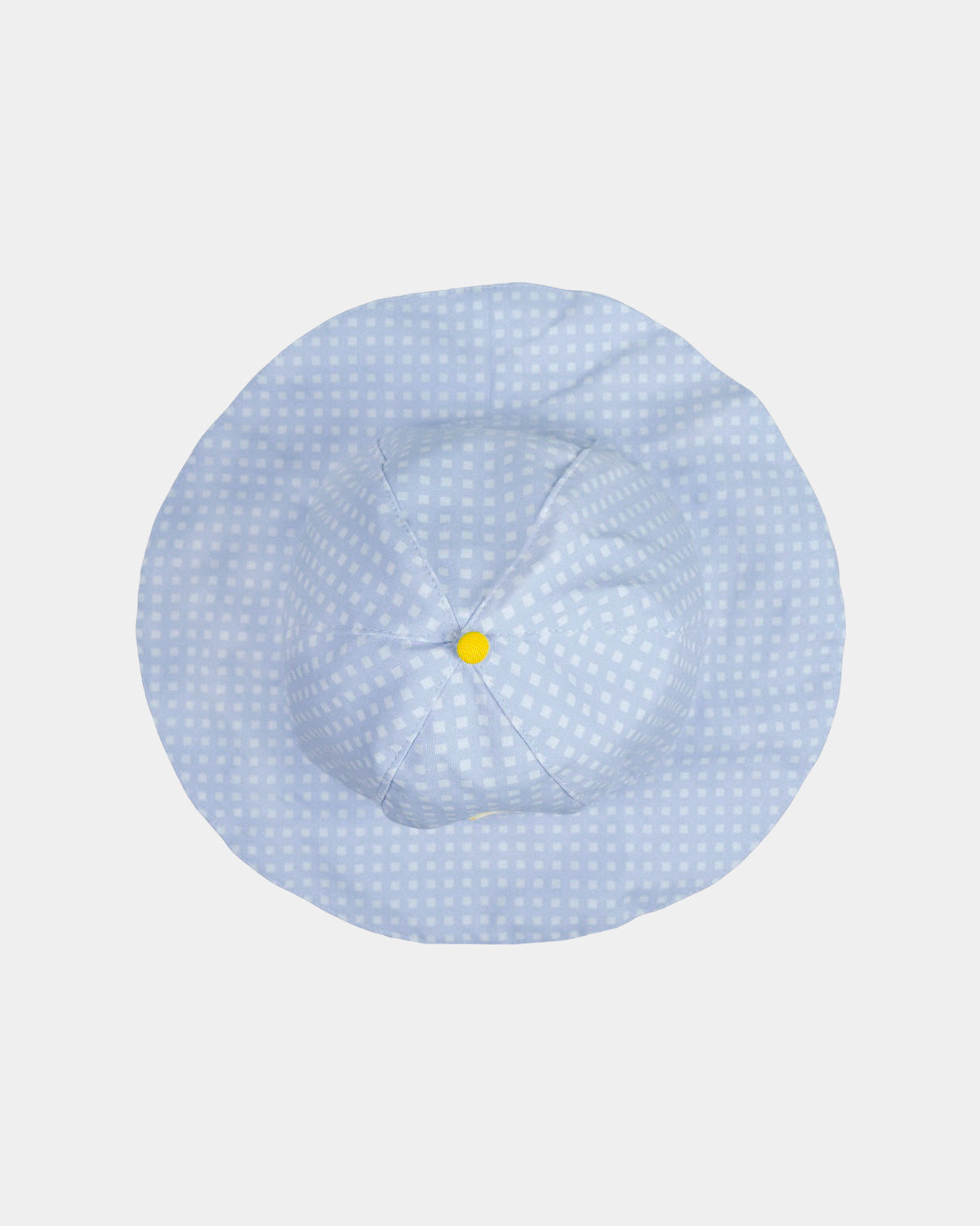 Este elegante sombrerito está confeccionado en tejido de poliamida con un 18% de lycra, con certificado de protección ultravioleta. Además, este tejido aporta elasticidad y facilita la colocación del gorro. Tiene un ala ancha muy elegante y protectora. Dispone de una cinta, también de tejido elástico, para sujetar debajo de la barbilla. El estampado vichy azul de nuestra serie Patos, es un estampado atemporal y fácil de combinar.