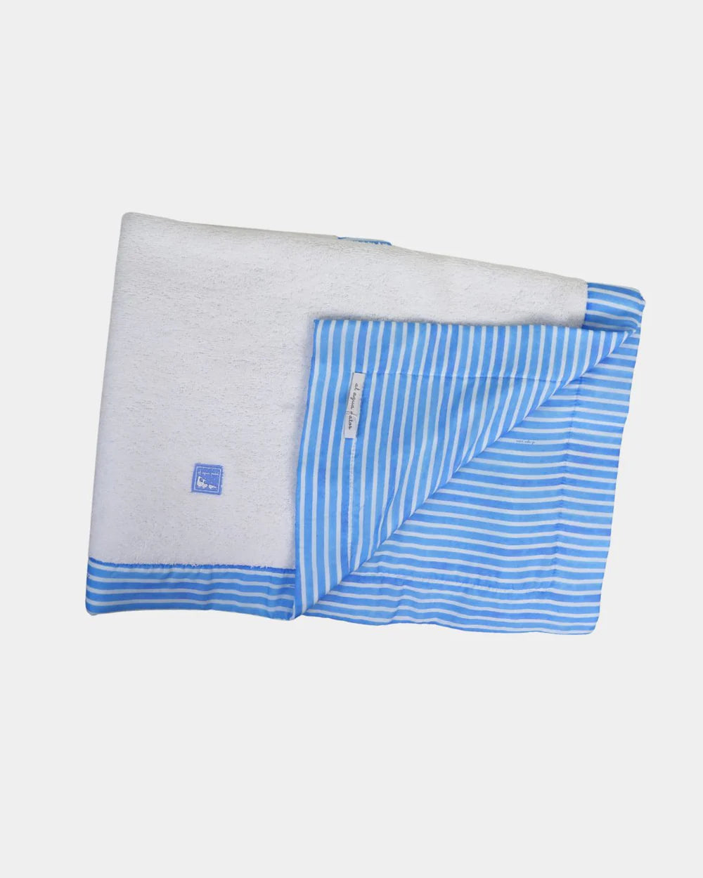 Toalla confeccionada en rizo de algodón 100% y con estampado de la serie Rayas. El bordado está confeccionado artesanalmente, y es del mismo tejido que el resto de la toalla, para que incluso esta parte, sea muy suave y seque perfectamente. Las medidas son 130x75 cm.