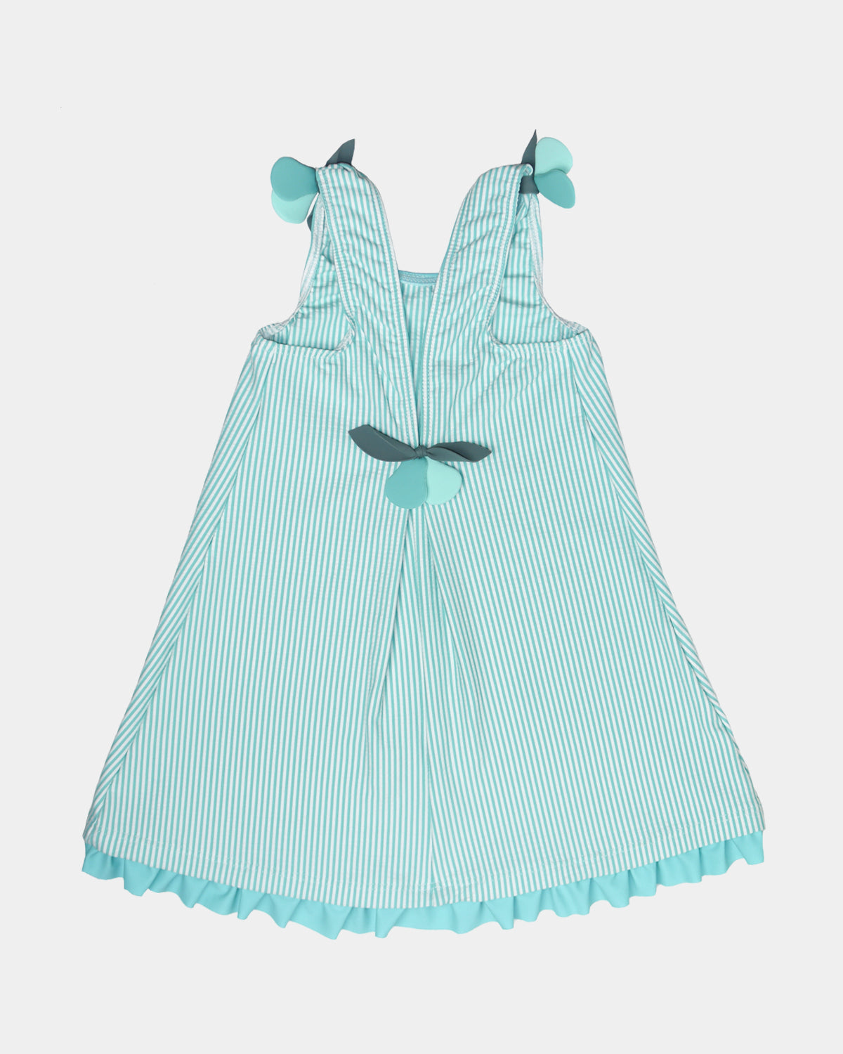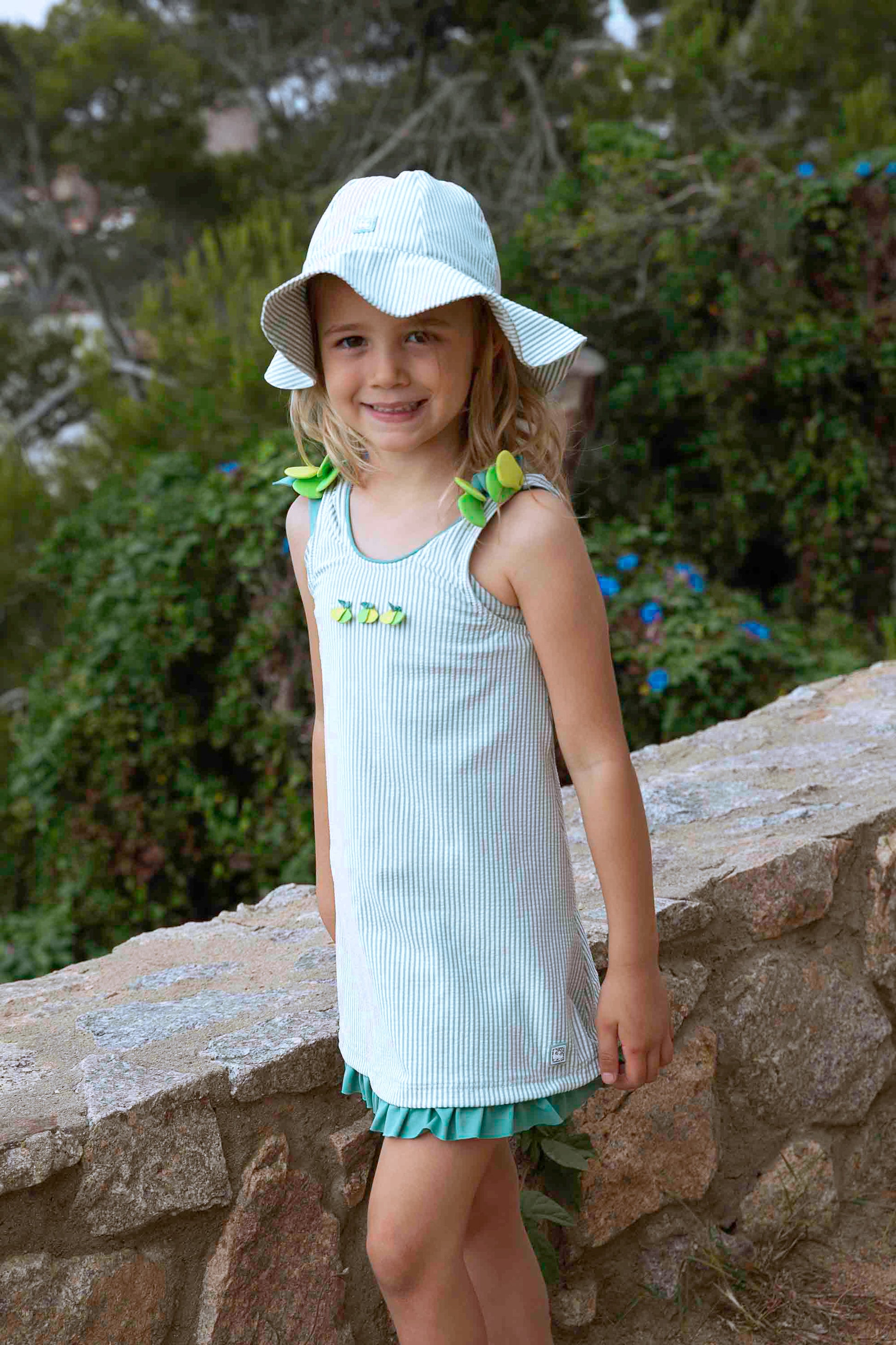 Este vestido está confeccionado en tejido de poliamida con un 18% de licra, esto puede parecer absurdo por que no sirve para bañarse, pero tiene la ventaja de que no se arruga, es cómodo, y al final del verano sus colores están como el primer día. Los lacitos de los hombros y la parte posterior además de anudados, van cosidos para evitar que se pierdan. En el pecho lleva bordado el anagrama de nuestra marca : una familia de patitos. Esta es una de nuestras prendas estrella, quien lo prueba repite!