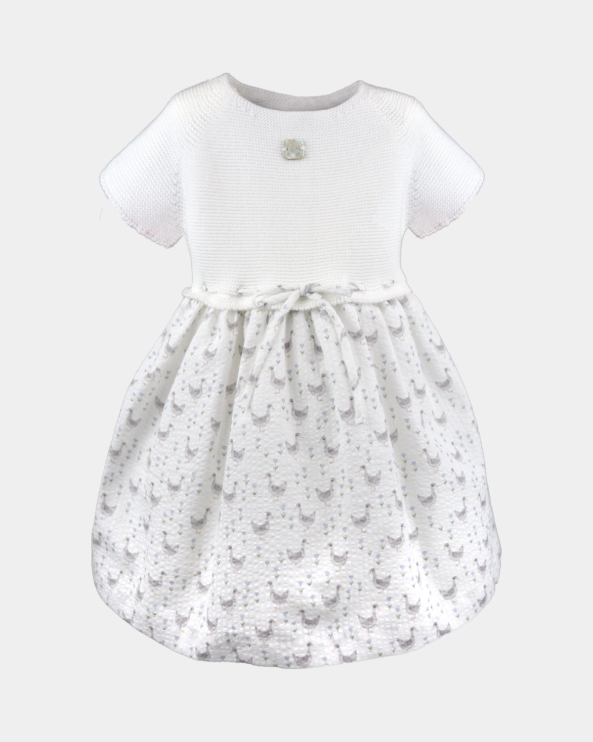 Este vestido reúne comodidad y belleza, su parte superior de punto hace que se adapte a todos los tipos con gran confort. La falda estampada tiene mucho vuelo y es veraniega y fácil de llevar. Todo el vestido está confeccionado en algodón 100%.